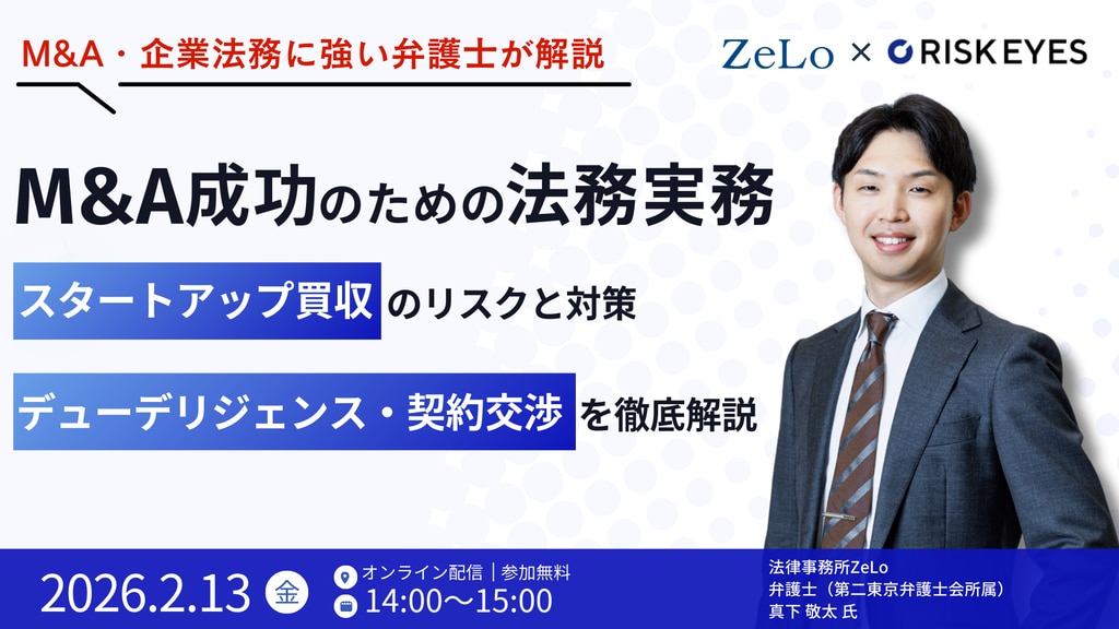 本セミナーでは、M&A実務に精通した真下敬太弁護士(法律事務所ZeLo)が、M&Aの主に買い手側の視点から、M&Aの基礎知識や実務まで体系的に解説。M&A全体の流れを理解したうえで、法務デューデリジェンスや株式譲渡契約における実践的なノウハウをお伝えします。あわせて、スタートアップを対象とするM&Aで特に注意すべき点についても取り上げ、成長企業が陥りがちな落とし穴とその対応策を解説します。