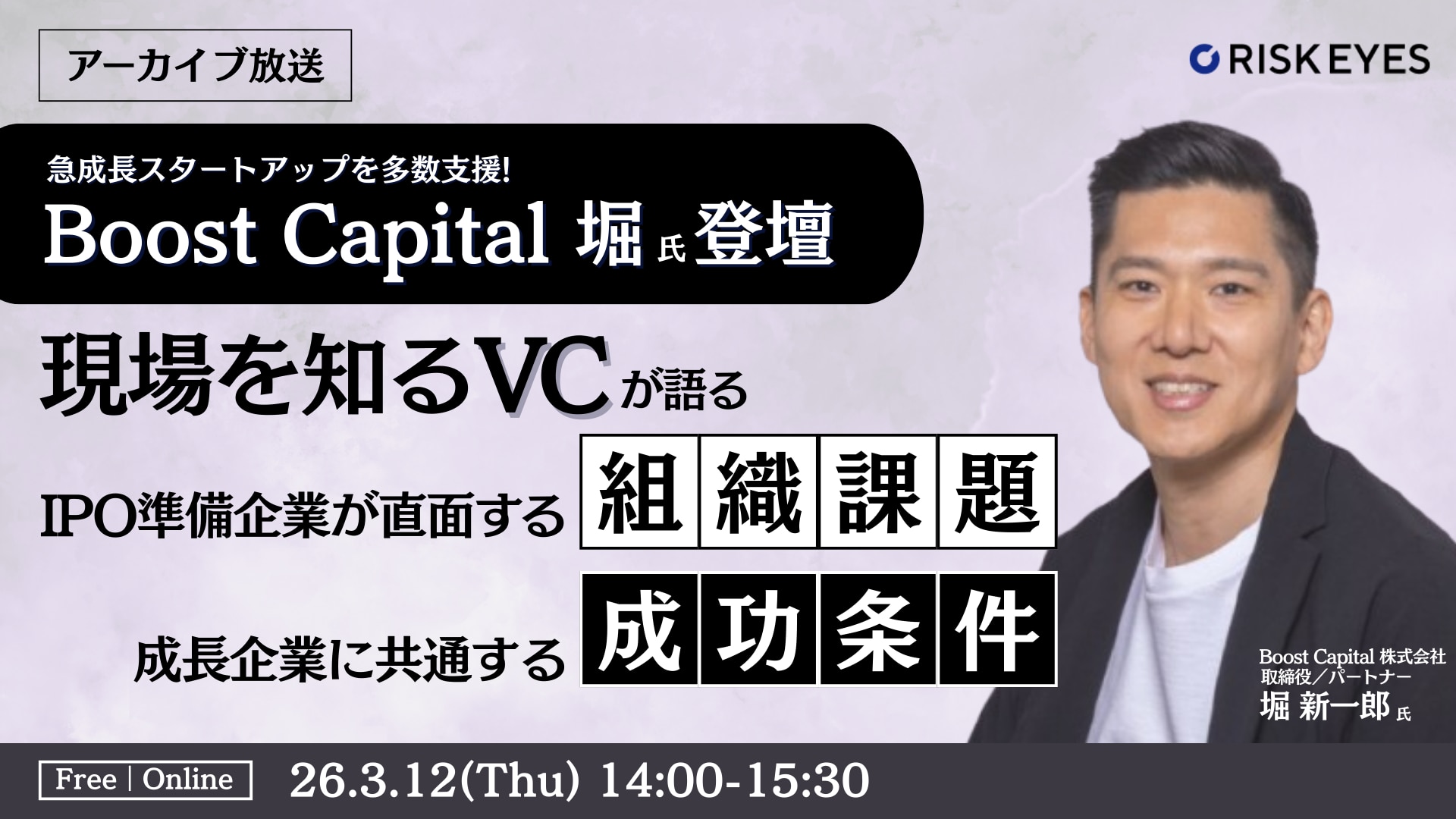 本セミナーでは、数多くの成長企業の投資判断や支援を通じて 、企業の“内側”と“外側”の両面に触れてきた Boost Capital株式会社 代表/パートナーである堀 新一郎 氏をお迎えします。VCとして多くの企業の成長プロセスを見守ってきた堀氏ならではの視点で、企業のどこに「評価」が生まれるのか、セッション形式でお届けします。