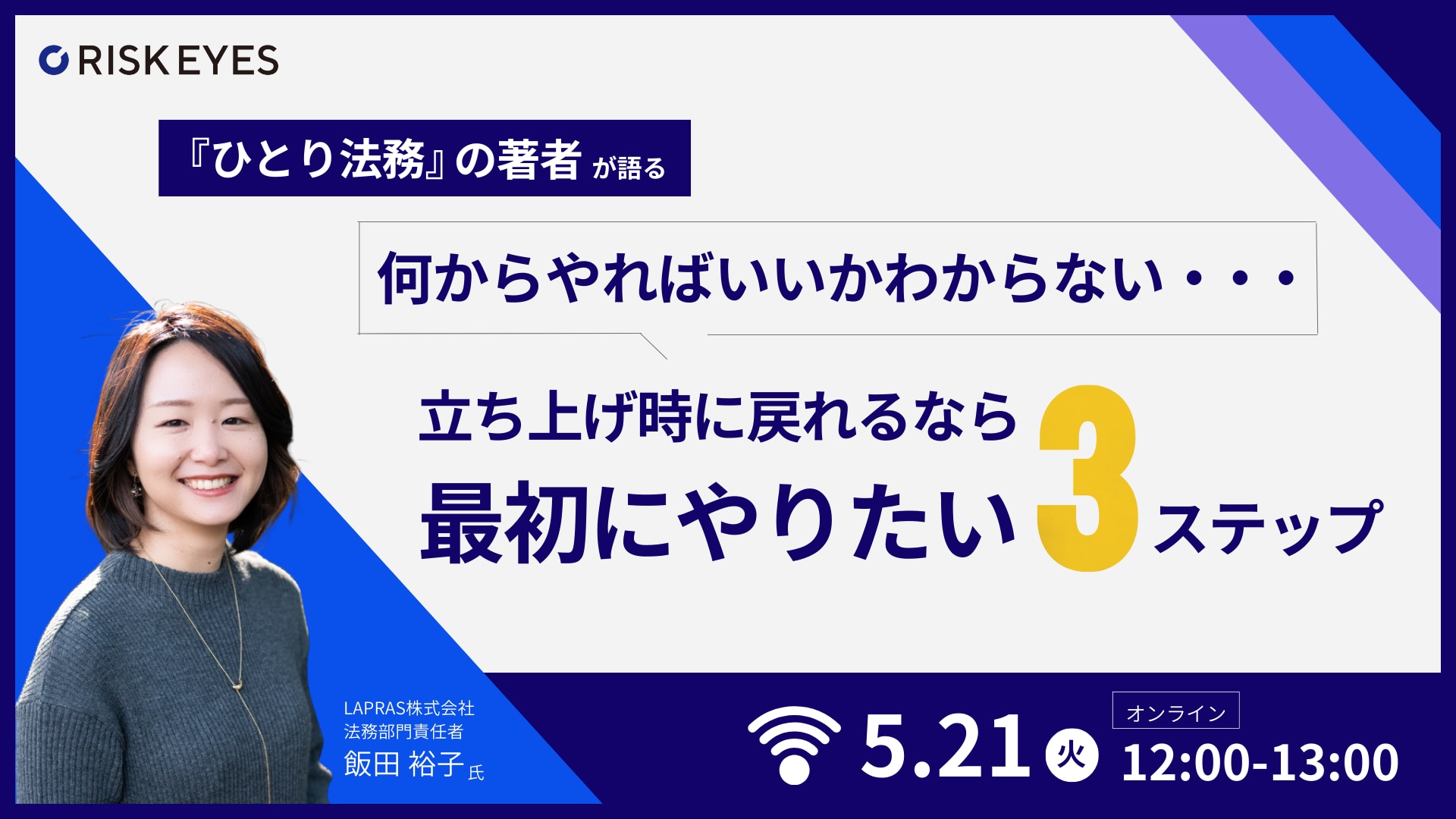 本セミナーでは、LAPRAS株式会社 法務部門責任者 飯田裕子氏をお迎えし、ひとり法務としてゼロから法務部門を立ち上げた経験をもとに、自社の法務業務をどのように整理するのか、社内との期待値をどのようにすり合わせるのか、限られたリソースの中で優先順位をどう設計するのかといった「まず最低限やるべきこと」を、実務の視点から整理します。